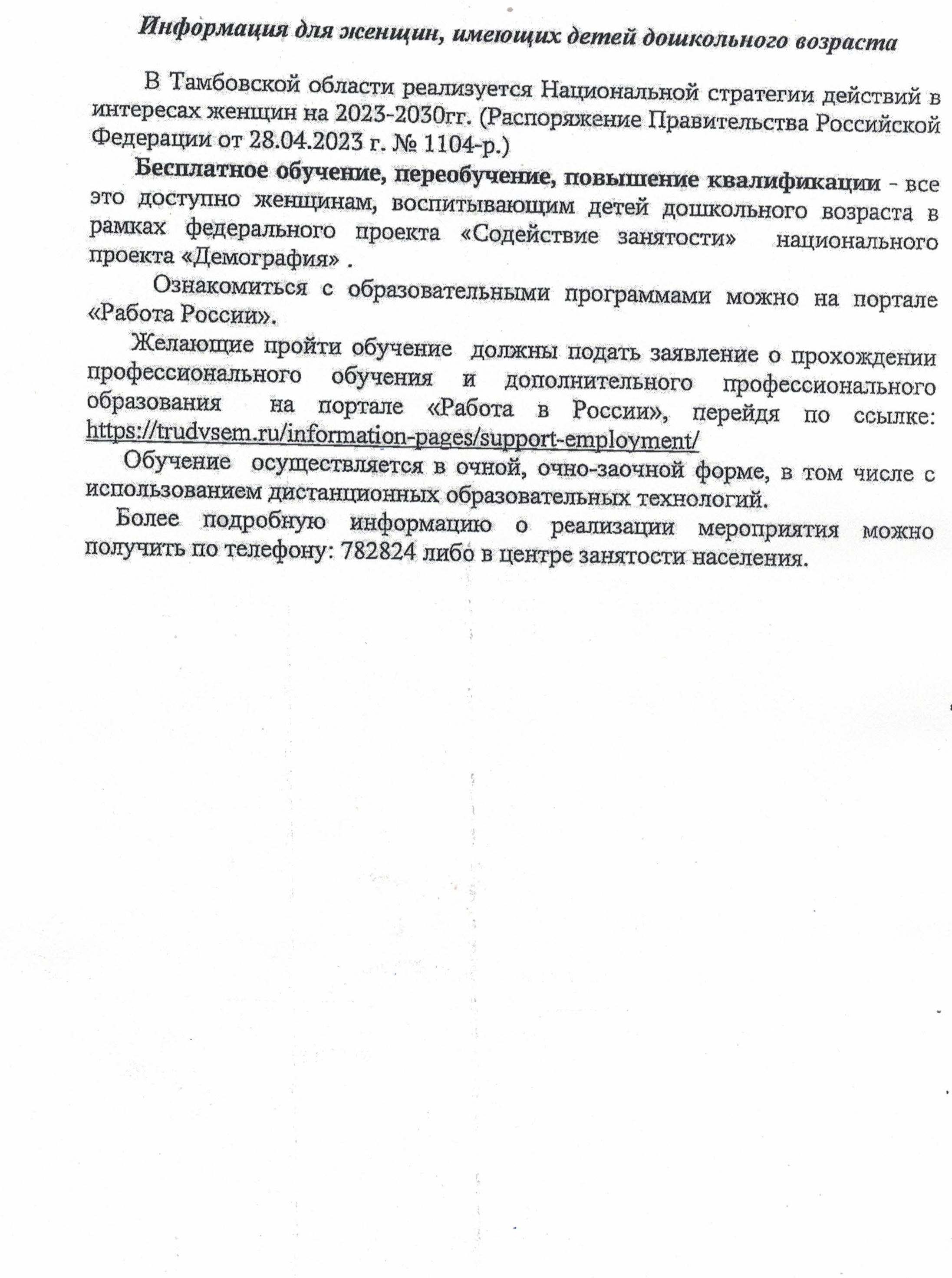 Информация для женщин, имеющих детей дошкольного возраста.